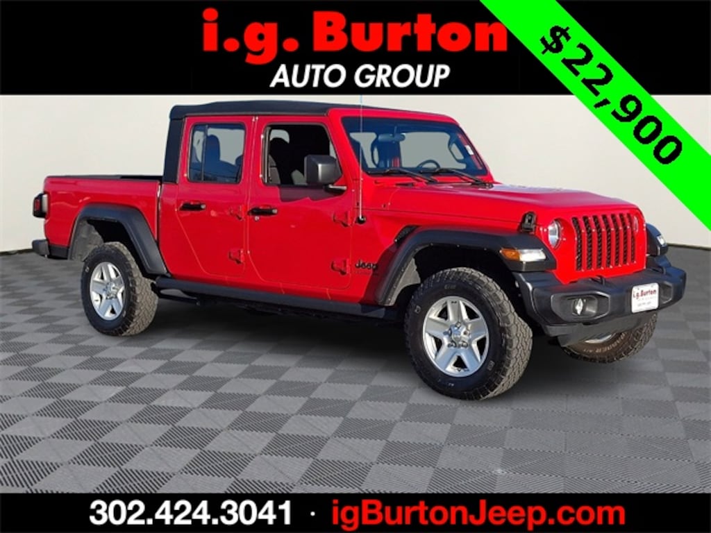 *CERTIFIED, !!!((( SEE IT AT THE MILFORD JEEP LOCATION!!!)))!!!, ***THIS VEHICLE IS SCHEDULED TO LEAVE FOR MANHEIM AUTO AUCTION AND IS BEING OFFERED AT WHOLESALE PRICE, Gladiator Sport, 4D Crew Cab, 3.6L V6 24V VVT, 8-Speed Automatic, 4WD, Firecracker Red Clearcoat, Black Cloth, 1-Year SiriusXM Radio Service, 240 Amp Alternator, 7.0" Touch Screen Display, 700 Amp Maintenance Free Battery, Air Conditioning w/Auto Temperature Control, Apple CarPlay, Automatic Headlamps, Auxiliary Switch Group, Auxiliary Switches, Class IV Hitch Receiver, Cluster 7.0" TFT Color Display, Convenience Group, Deep Tint Sunscreen Windows, For More Info, Call 800-643-2112, Front 1-Touch Down Power Windows, Google Android Auto, GPS Antenna Input, Heavy-Duty Engine Cooling, Integrated Center Stack Radio, Leather Wrapped Steering Wheel, Normal Duty Plus Suspension, Power Heated Mirrors, Power Tailgate Lock, Quick Order Package 23S, Quick Order Package 24S, Radio: Uconnect 4 w/7" Display, Remote Keyless Entry, Security Alarm, SiriusXM Satellite Radio, Speed Sensitive Power Locks, Sun Visors w/Illuminated Vanity Mirrors, Technology Group, Trailer Hitch Zoom, Trailer Tow Package, Universal Garage Door Opener, USB Host Flip, Wheels: 17" x 7.5" Tech Silver Aluminum. 2020 Jeep Gladiator Sport Since 1908, i.G. Burton Auto Group has served Delmarva and its surrounding communities with outstanding sales and service as its longest-standing family-owned and operated dealer group. See why we proudly say, "Nobody Beats a Burton Deal! NOBODY!"