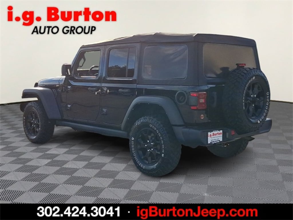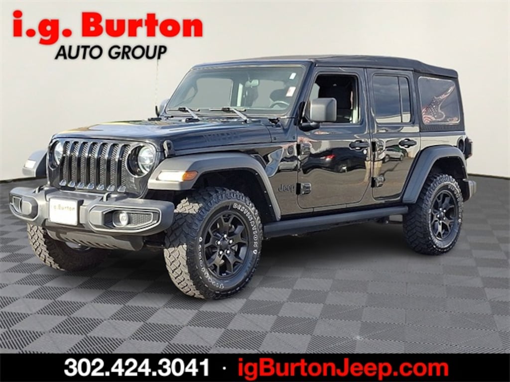 *CERTIFIED, !!!((( SEE IT AT THE MILFORD JEEP LOCATION!!!)))!!!, CLEAN CARFAX, LOCAL ONE OWNER TRADE, ***THIS VEHICLE IS SCHEDULED TO LEAVE FOR MANHEIM AUTO AUCTION AND IS BEING OFFERED AT WHOLESALE PRICE, ***THIS VEHICLE IS SCHEDULED TO LEAVE FOR MANHEIM AUTO AUCTION AND IS BEING OFFERED AT WHOLESALE PRICE, ***THIS VEHICLE IS SCHEDULED TO LEAVE FOR MANHEIM AUTO AUCTION AND IS BEING OFFERED AT WHOLESALE PRICE, ***THIS VEHICLE IS SCHEDULED TO LEAVE FOR MANHEIM AUTO AUCTION AND IS BEING OFFERED AT WHOLESALE PRICE, ***THIS VEHICLE IS SCHEDULED TO LEAVE FOR MANHEIM AUTO AUCTION AND IS BEING OFFERED AT WHOLESALE PRICE, Wrangler Unlimited Willys, 4D Sport Utility, 8-Speed Automatic, 4WD, Black Clearcoat, 4-Wheel Drive Swing Gate Decal, Anti-Spin Differential Rear Axle, Automatic Headlamps, Black Grille, Black Trail Rated Badge, Blind Spot & Cross Path Detection, Cigar Lighter, Cold Weather Group, Convenience Group, Deep Tint Sunscreen Windows, Front 1-Touch Down Power Windows, Front LED Fog Lamps, Heated Front Seats, Heated Steering Wheel, Injection Molded Black Rear Bumper, Leather Wrapped Steering Wheel, LED Headlamp & Fog Lamp Group, LED Premium Reflector Headlamps, LED Taillamps, Matte Black Jeep Badge, Mold In Color Bumper w/Gloss Black, MOPAR All-Weather Floor Mats, ParkSense Rear Park Assist System, Power Heated Mirrors, Quick Order Package 22W Willys, Remote Keyless Entry, Removable Ash Tray, Safety Group, Security Alarm, Smoker's Group, Speed Sensitive Power Locks, Sun Visors w/Illuminated Vanity Mirrors, Universal Garage Door Opener, Wheels: 17" x 7.5" Moab Black Aluminum, Willys, Willys Hood Decal, Wrangler Decal. 2021 Jeep Wrangler Unlimited Willys Odometer is 1760 miles below market average! Since 1908, i.G. Burton Auto Group has served Delmarva and its surrounding communities with outstanding sales and service as its longest-standing family-owned and operated dealer group. See why we proudly say, "Nobody Beats a Burton Deal! NOBODY!"